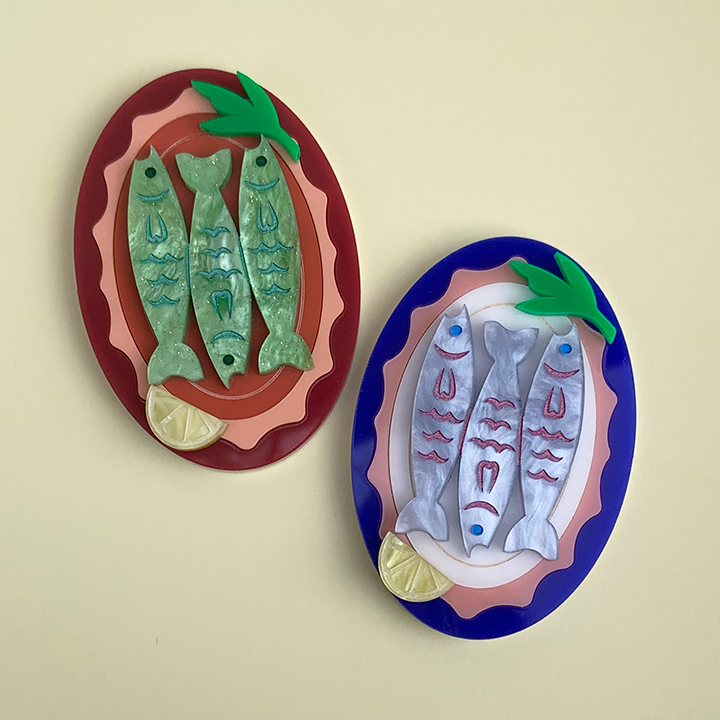 Fishlass Catch brooch is laser cut in navy, clay, white and pearl blue acrylic, with hand painted detail.